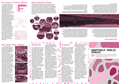 A forward-looking design proposal exploring adaptive public environments that respond to human needs rather than requiring people to conform. Developed as an A2 double-sided printed broadsheet and accompanying design journal, the project integrates speculative design principles with accessible visual communication. Rooted in research into critical and narrative design from pioneers like Superflux and Dunne & Raby, the work envisions sustainable, inclusive futures through modular systems, AI, and renewable infrastructure. Iterative feedback shaped the composition and hierarchy to enhance clarity and engagement, underscoring the project’s role as both creative exploration and social commentary.