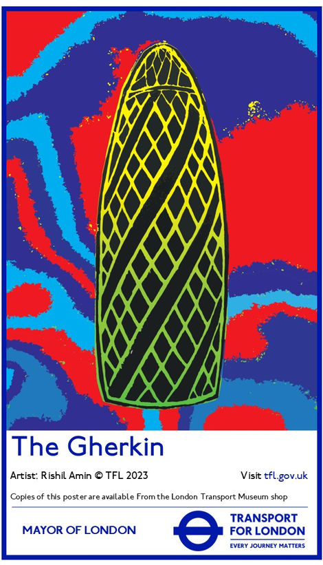A bold, mixed-media poster invented for Transport for London, celebrating the city’s iconic Gherkin building. The piece began as a hand-carved lino print to emphasise texture and form, then scanned and digitally enhanced in Adobe Illustrator. The final artwork features detailed linework, a vibrant red-to-blue gradient background, and TfL branding, crafted to appeal to tourists and city explorers. Displayed here in situ as part of a citywide promotional campaign concept.